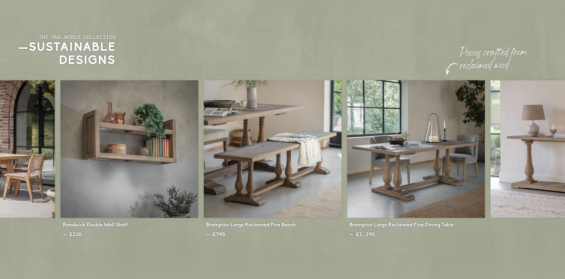 For One.World, sustainability is woven into the design story. The Shopify Plus interiors brand is known for its characterful, design-led collections, including pieces crafted from reclaimed wood. Alongside responsible sourcing, the brand backs every customer purchase with climate action, planting a tree for every order through Ecologi.