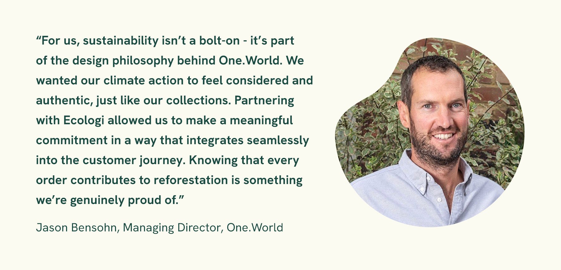 One.World has been funding climate action with Ecologi since January 2022 and installed the Ecologi Shopify App in April 2025 as their e-commerce setup evolved. They also have an active Climate Action Workforce subscription.